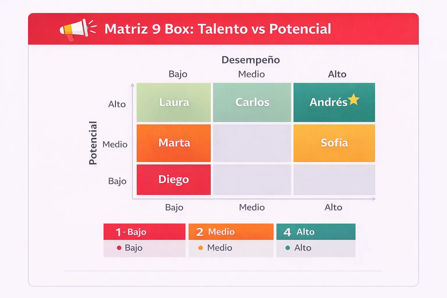 La matriz 9 box es una herramienta que ayuda a visualizar a los colaboradores bajo dos criterios: el nivel de desempeño actual y qué tanto puede crecer en el futuro. La matriz se divide en nueve espacios; en un lado se pone el nivel de desempeño y del otro el nivel del potencial. Al cruzarlos, cada persona queda ubicada en uno de los nueve cuadrantes.